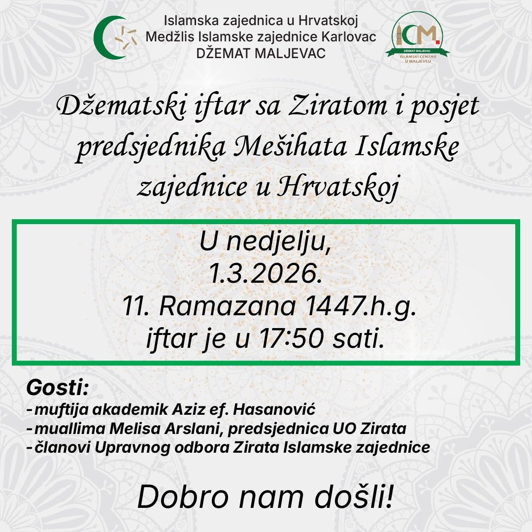 U nedjelju je Džemat Maljevac imao čast ugostiti muallimu Melisu Arslani, predsjednicu Upravnog odbora Zirata Islamske zajednice u Hrvatskoj, humanitarne organizacije čija podružnica u Maljevcu uspješno djeluje u okviru Džemata Maljevac. U njezinoj pratnji bili su članovi Upravnog odbora Amir Kerić, Enes Obarčanin i Danijela Mandžić.
